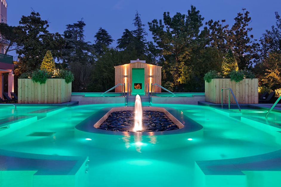 Descubra la zona termal de 1.000 m² que dispone de 3 piscinas termales con chorros de hidromasaje. 2 piscinas exteriores térmicas (31-32 ° C), una de las cuales está rodeada por el impresionante paisaje de las Colinas Euganeas.
