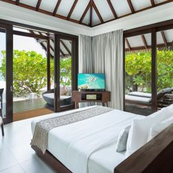150 modernas villas y suites con acceso directo a la playa, terraza privada, ducha al aire libre y máquina de espresso. La Sunset Pool Beach Villa incluye además una piscina privada. La Ocean Villa está sobre el agua. La Family Beach Villa es una de las villas familiares más grandes de las Maldivas y cuenta con jacuzzi. Más villas disponibles bajo petición.