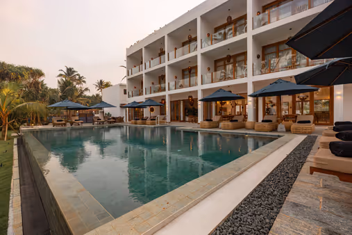 El Boutiquehotel Villa Lanka Flair, inaugurado en 2025, ofrece el entorno ideal para un retiro integral junto al mar. Usted disfrutará de aplicaciones de Ayurveda de primera clase, una exquisita gastronomía y relajante yoga en un hotel gestionado de manera familiar con solo 16 habitaciones. El hotel cautiva con un diseño moderno y personalizado, gran atención al detalle y un toque de extravagancia elegante. Desde la terraza de yoga, se abre una amplia vista sobre el mar azul profundo, donde el sol se sumerge en el horizonte cada atardecer. El jardín tropical, con un antiguo palmeral y una vegetación exuberantemente floreciente, rodea el hotel de manera armoniosa. En la playa privada, a lo largo de la piscina de piedra natural de 15 metros y en el jardín, numerosas tumbonas con sombrillas invitan a relajarse plácidamente. Lugares de retiro como la cabaña de playa cubierta de hojas de palma o la biblioteca abierta hacia el jardín crean un ambiente especialmente elegante, ideal para relajarse con una taza de té y dejar volar el espíritu.