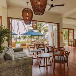 Un amplio salón de lectura con una extensa biblioteca invita a la lectura y al descanso. Se complementa con una selección de juegos de cartas y de mesa. Semanalmente se realiza una demostración de cocina ayurvédica y una charla informativa seguida de un debate. Aquí obtendrá interesantes perspectivas sobre los fundamentos del Ayurveda - desde la filosofía y la enseñanza de los tres doshas, hasta la nutrición y los tratamientos, incluyendo la medicina ayurvédica. Además, el equipo del hotel estará encantado de ayudarle a planificar experiencias especiales en los alrededores - ya sea un paseo en barco por la laguna cercana o una de las diversas excursiones por la región. Quienes prefieran la tranquilidad, encontrarán relajación en la piscina o paseando por la playa. La acogedora cabaña de playa, hamacas y rincones diseñados con cariño en el jardín tropical invitan a relajarse, desconectar y disfrutar.